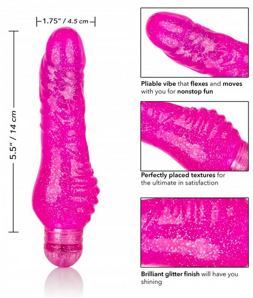 Pehmeä, joustava ja kimmoisa upeasti kimalteleva sauva herkkuhetkiin! Portaattomasti säädettävä tehokas vibra, vedenpitävä. Terska ja varsi muotoiltu lisäämään nautintoasi. Isosta, karhennetusta juuriosasta saat pitävän otteen liukkaammallakin kädellä. Tuoksuton materiaali. Pituus 14 cm, halkaisija 4,5 cm.
